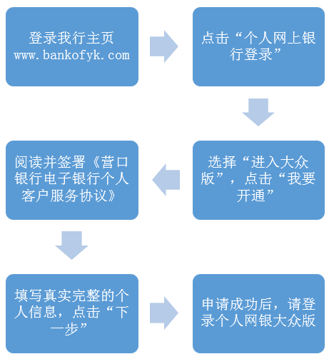 持有營口銀行卡或存折的客戶,可以通過任意一臺連接Internet的電腦登錄m.msekt.com自助注冊營口銀行個人網(wǎng)上銀行大眾版,具體操作流程如下: